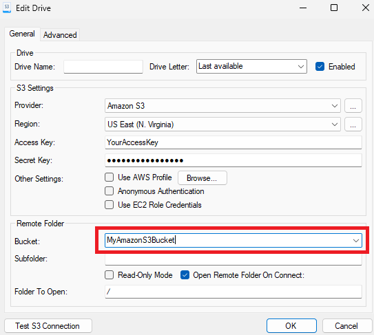 S3 Drive can connect to any S3-compatible provider. Many common providers are already defined, including Amazon S3. The instructions below cover adding a custom provider for Amazon S3. To add a custom provider, view this article.