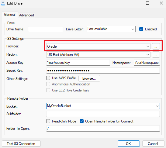 S3 Drive can connect to any S3-compatible provider. Many common providers are already defined, including Oracle. The instructions below cover adding a custom provider for Oracle. To add a custom provider, view this article.