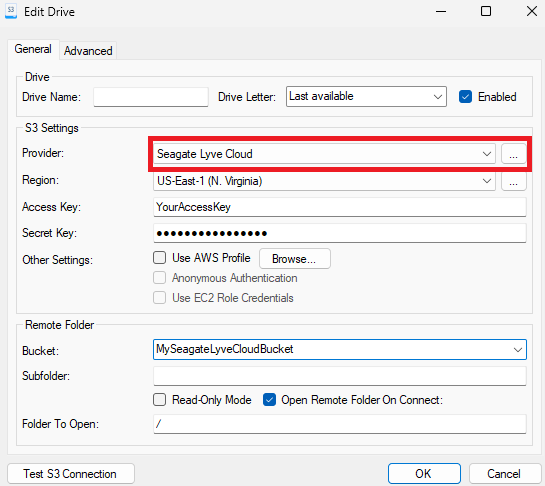 S3 Drive can connect to any S3-compatible provider. Many common providers are already defined, including Seagate Lyve Cloud. The instructions below cover adding a custom provider for Seagate Lyve Cloud. To add a custom provider, view this article.