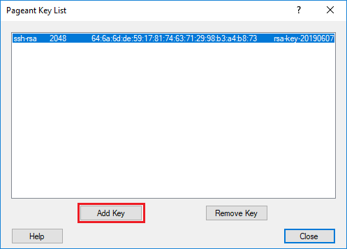 To load your key in Pageant, first start the Pageant application. Click Add Key and browse your file system for the private key. If prompted, enter the key passphrase. You should now see your key listed in Pageant.