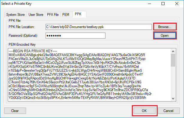 For example, if your key has a .pem or .ppk file extension, click the corresponding tab in the window, click Browse, and select your key from the file system. Then, enter the password associated with the key (if there is one) and click Open. If the password is correct, the PEM-Encoded Key field will be filled and you can click OK to load it, which will close the Select a Private Key window.